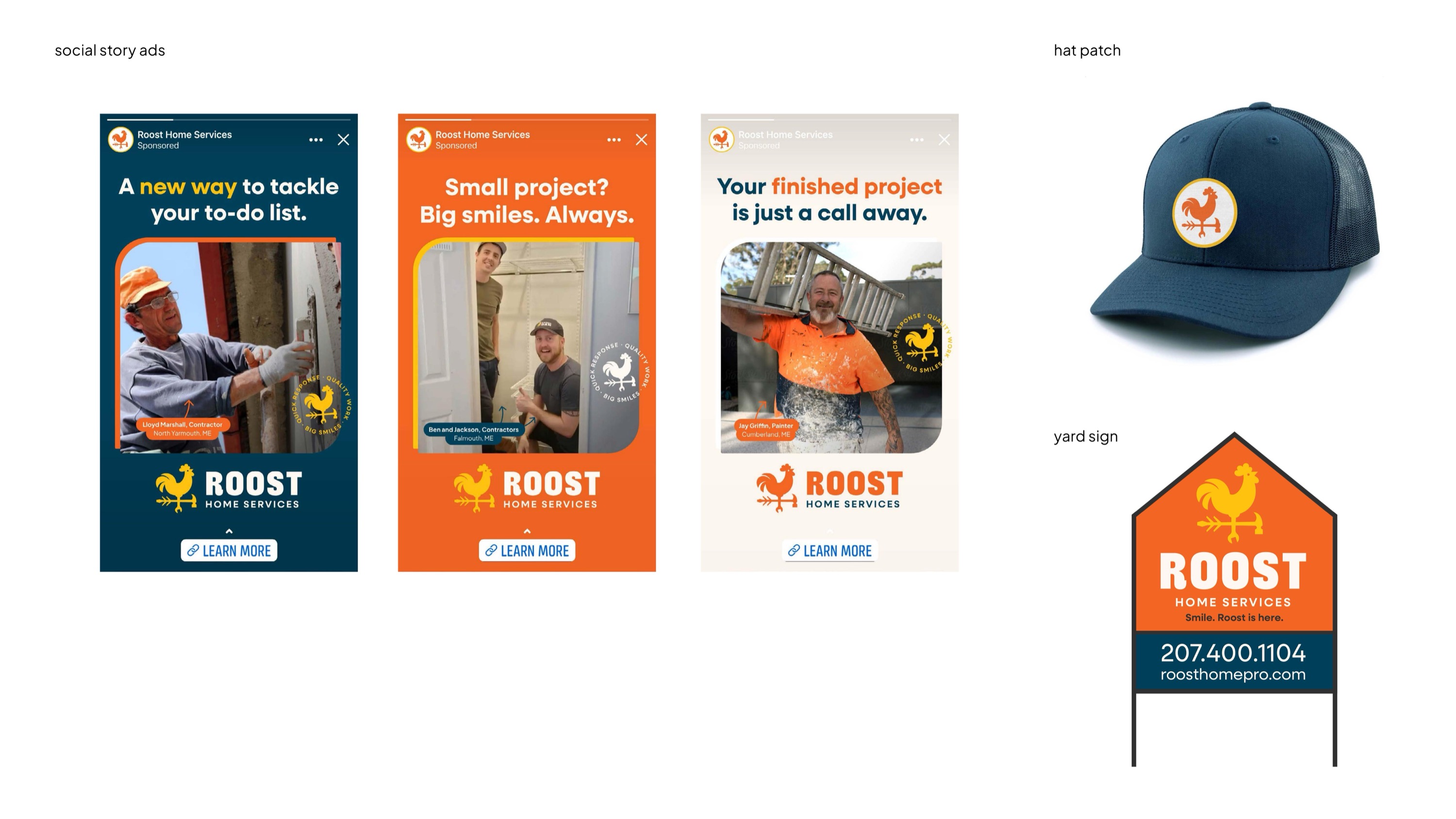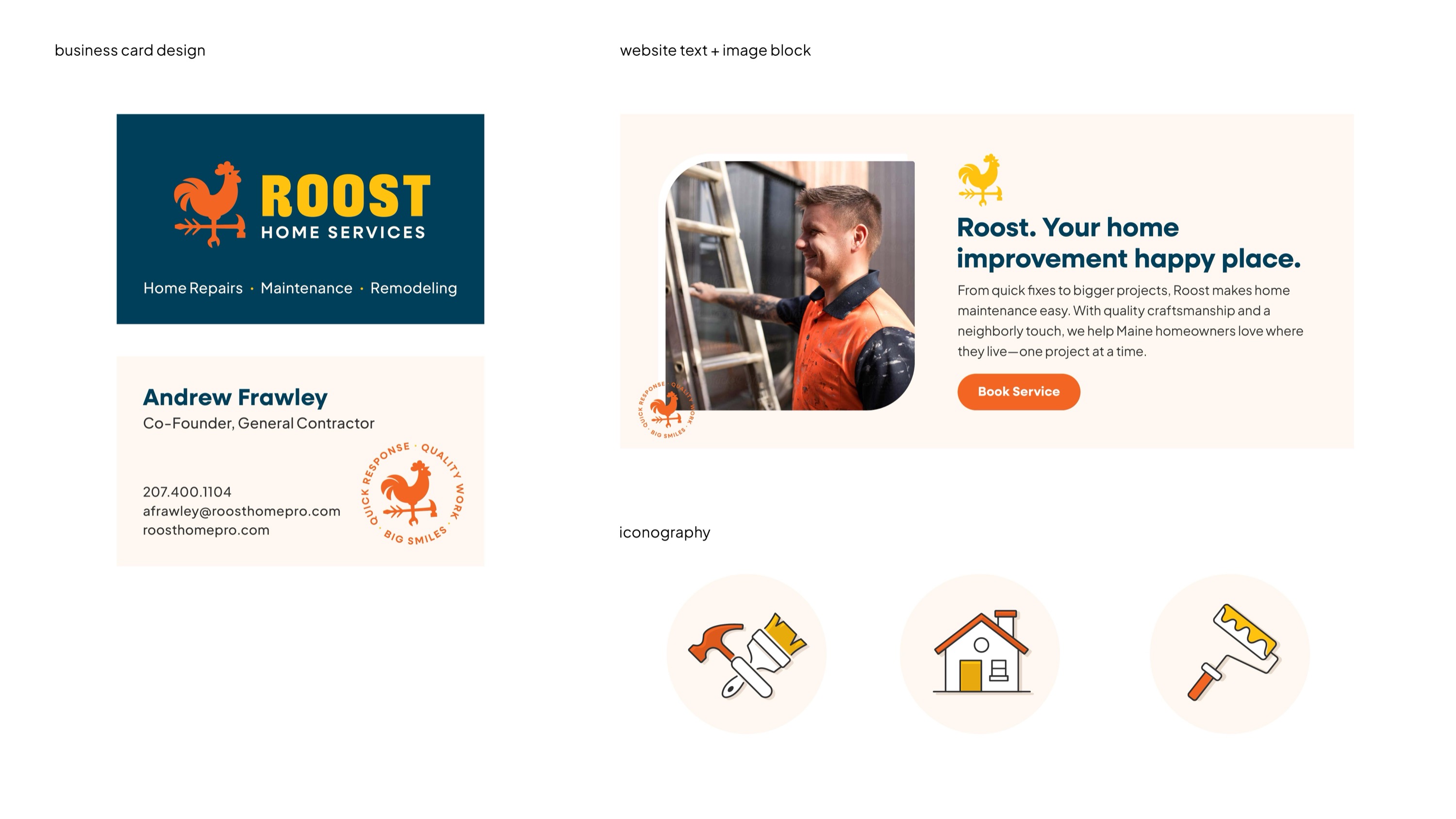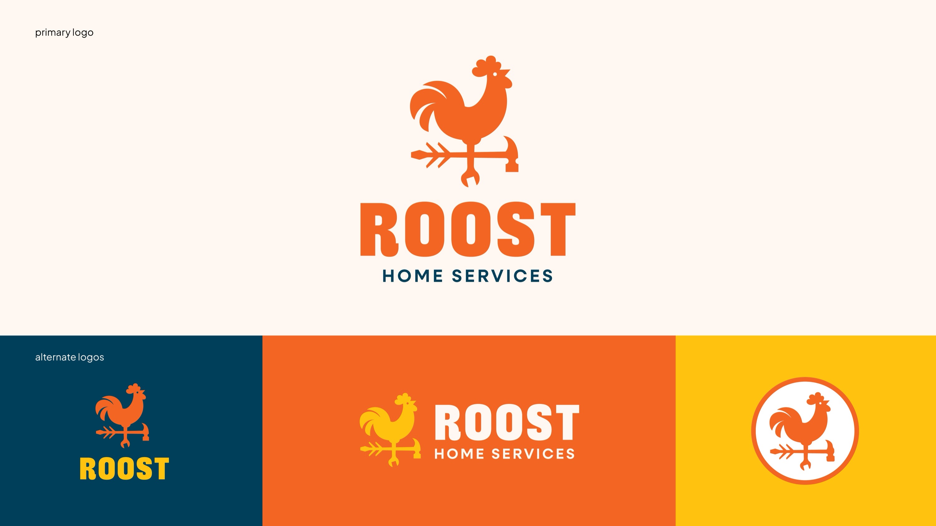 Roost set out to bring clarity, quality, and peace of mind to the often chaotic world of home repair—especially for busy, high-end homeowners in Southern Maine. With a curated network of skilled tradespeople and a single point of contact, Roost makes it easy to manage everything from window rot to deck repairs with clear estimates, responsive communication, and real progress updates. The identity needed to feel professional yet warm—trustworthy without being dry. The resulting brand system strikes that balance through a confident color palette, friendly type, and a distinctive mark that combines a rooster and tools—symbolizing both dependability and craft. From logomark to messaging, every detail was designed to help Roost stand out in a crowded category and signal a new, more enjoyable way to get things done around the house.